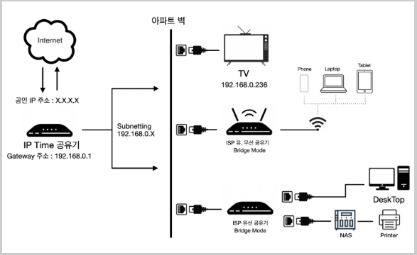 내 방에서 브릿지 모드로 사용하는 공유기이다. 현재 우리집은 192.168.0.1 의 ipTime 공유기가 인터넷 신호를 받고, 각 방의 벽마다 있는 유선 포트로 인터넷 신호를 전달해준다. 내 방에서는 공유기를 유선으로 벽의 랜 포트와 연결하였고 이에 192.168.0.26 의 주소를 할당 받았다. 이 공유기에 이제 데스크탑, NAS 등이 유선 연결되어 있다.