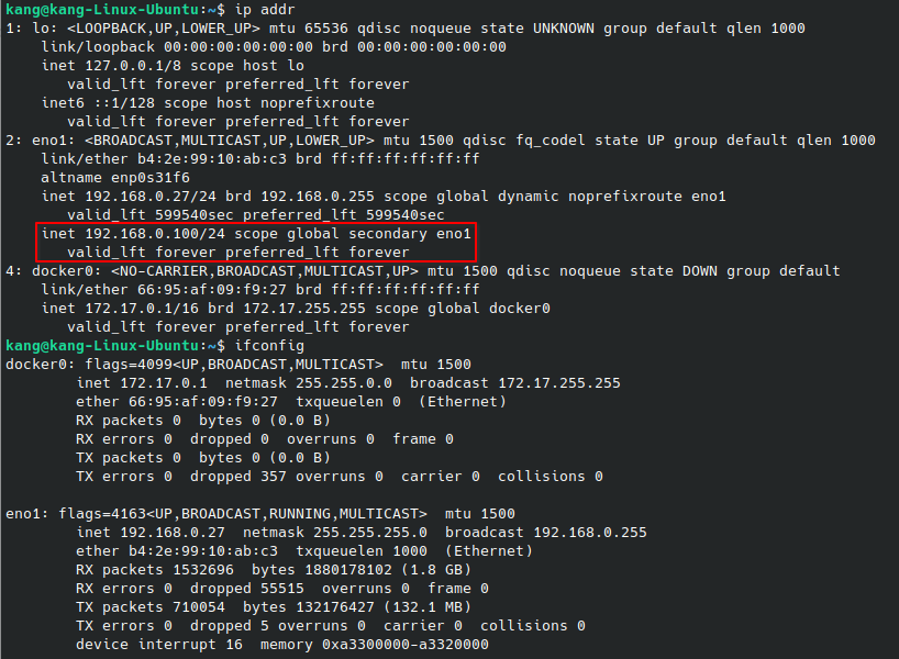 ip addr 명령어를 통해, 네트워크 인터페이스에 두 번째 ip 가 추가된 것을 확인할 수 있다. 참고로 ifconfig 명령어에서는 두 번째 ip 주소를 확인할 수 없었다. 이제 ip addr 로 쓸거다.