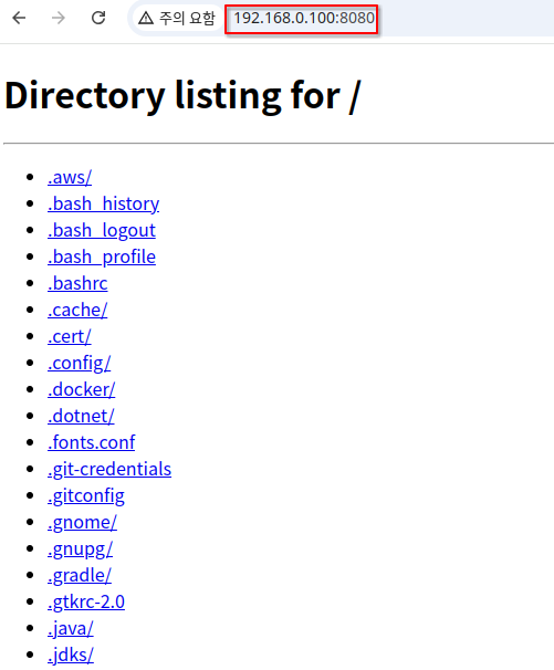 위의 명령어를 입력하면, 내 로컬 서버가 실행되어서 로컬 디렉터리를 웹 브라우저에서 접근할 수 있다. 터미널에서 명령어를 입력하면 서버가 실행되었다고 나온다. 이 때 내 ip 주소를 입력하면 디렉터리 구조가 보이는 페이지가 보인다.