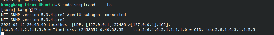 - Trap이 수신되었다는 것을 의미 즉, 로컬 컴퓨터(127.0.0.1) 에서 trap이 162번 포트로 정상 발송된 된 것
