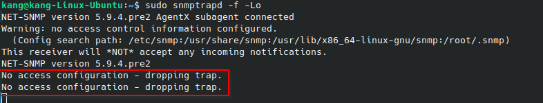 → access control 설정이 없어서 trap을 받아도 무시(drop) 하겠다는 경고. - No access configuration - dropping trap.