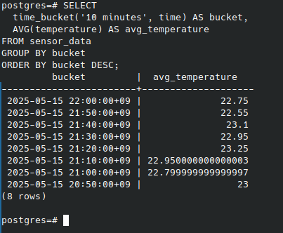 기존 PostgreSQL의 GROUP BY만으로는 복잡했던 시간대별 집계를, TimescaleDB는 time_bucket 하나로 아주 쉽게 처리할 수 있다.