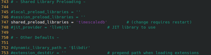 주석을 해제하고 shared_preload_libraries = 'timescaledb' (작은 따옴표) 로 입력하고 저장하고 나와야 한다.