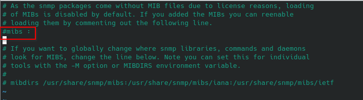 - 환경 설정 파일을 수정하여, 보안을 위해 차단한 MIB 로딩을 사용할 수 있도록 한다. ( 클라이언트가 MIB 읽을 수 있도록 mibs : 주석 처리)