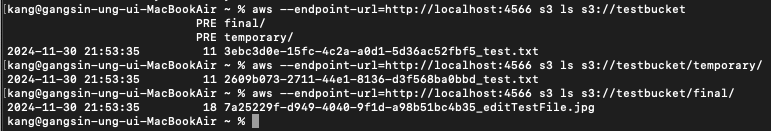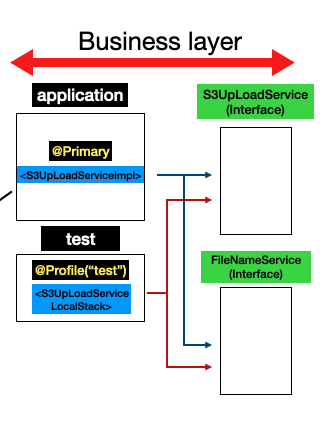 6. 이제 도커 컨테이너가 실행중 (localStack 이 실행중) 이므로 S3 bucket bean 을 생성하는 코드를 활용하여 testbucket 에 연결 하는 코드를 작성하였다. 참고로 AWS 업로드 기능을 인터페이스로 작성했고, 구현체로 실제 AWS Bucket 을 빈으로 주입받는 클래스가 있다. 이에 AWS 업로드 기능 인터페이스를 구현하되 localStack 의 testbucket을 빈으로 주입받도록 구현체를 새로 만들었다. (역할과 구현의 분리를 시도해봤다.)