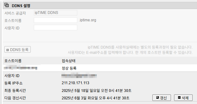 예전에 설정을 해 두었지만 DDNS 가 제대로 설정되어 있나 확인했다. 집 인터넷은 공인 IP가 수시로 바뀔 수 있어서, 외부에서 VPN 서버로 접속할 때 문제가 된다. 그래서 DDNS(Dynamic DNS) 를 설정해두면, 공인 IP가 바뀔 때마다 자동으로 도메인 주소에 연결된 IP도 갱신된다. 결국 (내가 설정한)문자열로 된 고정된 이름으로 언제든지 우리집 공유기를 찾을 수 있게 된다.