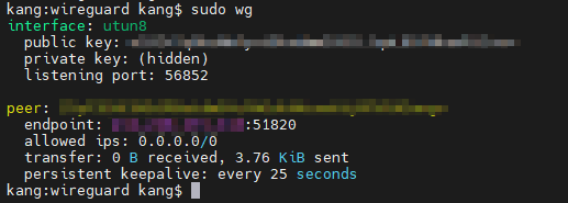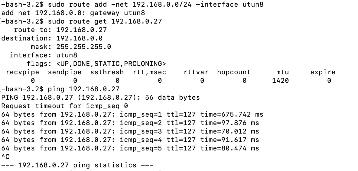 192.168.0.27 이라는 ip 는 내가 설정한 VPN 인터페이스인 utun8 을 이용하는 것을 확인할 수 있다. 또 현재 외부 네트워크에 접속한 상태임에도 192.168.0.27 과 ping test 에 성공하는 것을 알 수 있다.