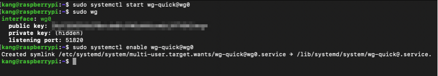 위의 명령어대로 WireGuard 를 시작하고 활성화 한다.