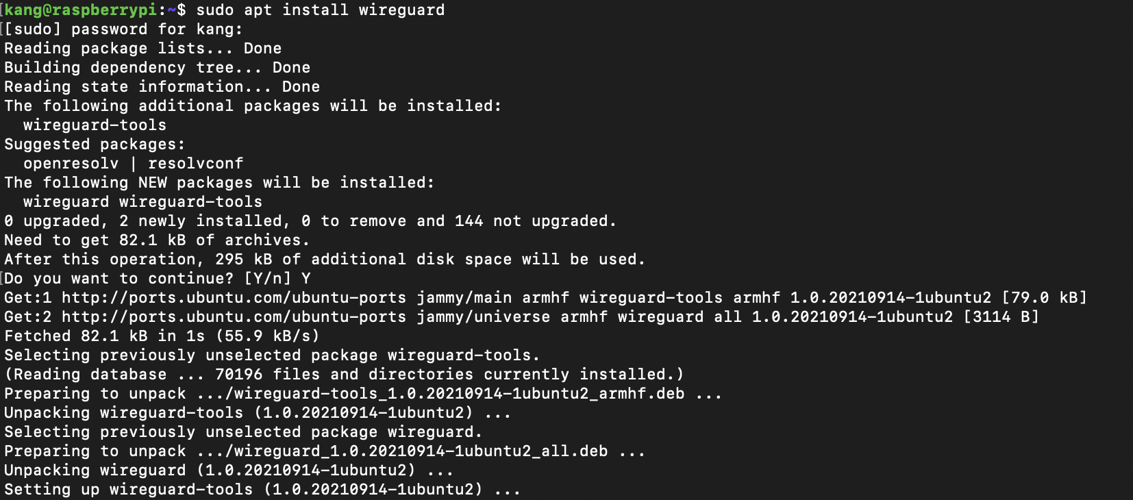 먼저 SSH 프로토콜로 Raspberry Pi 에 접속하고, apt update 후, wireguard 패키지를 설치해준다.