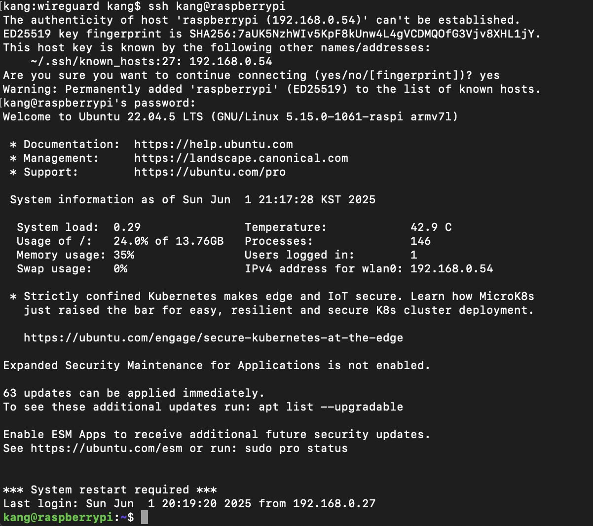 5-1. ssh kang@raspberrypi 로 접속 시도한다.