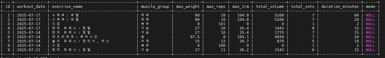 - workout_sessions: 운동 날짜, 부위, 최대 중량, 총 볼륨 등 한 번의 운동 요약