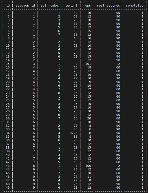 기존에는 하나의 테이블에 날짜, 운동명, 세트 수, 무게, 반복수 등을 모두 넣고 있었는데, 이 방식으로는 세트별 상세 기록이 불가능했고 운동별 분석이 어려웠다. 그래서 다음처럼 설계 구조를 개선했다:
