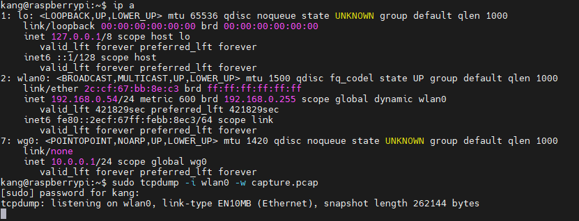 이 명령을 실행하면, eth0 인터페이스에서 오가는 모든 패킷을 capture.pcap이라는 이름의 파일로 저장하게 된다. 이 상태에서는 터미널에 아무 출력도 보이지 않고 조용히 저장만 된다. 캡처를 멈추고 싶으면 Ctrl + C를 누르면 된다.