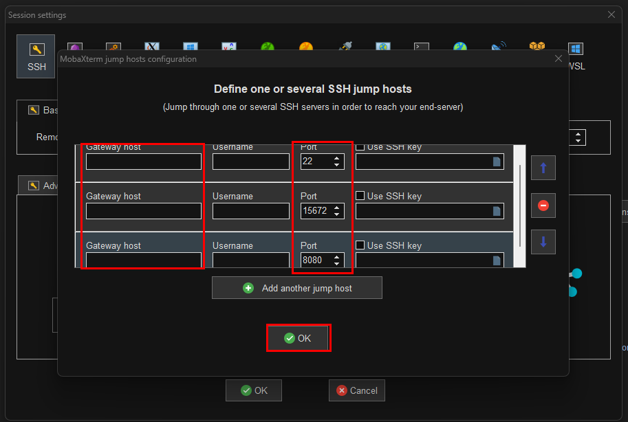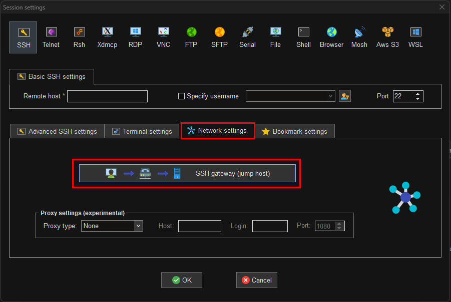 Network settings 탭을 클릭한 후 SSH gateway(jump host) 버튼을 클릭한다. 버튼을 클릭하여 목적지 ip 와 중계역할을 해줄 기기의 ip 주소를 입력해준다. 또 목적지에 접근하고자 하는 포트 번호도 입력하면 포트포워딩이 가능하다.