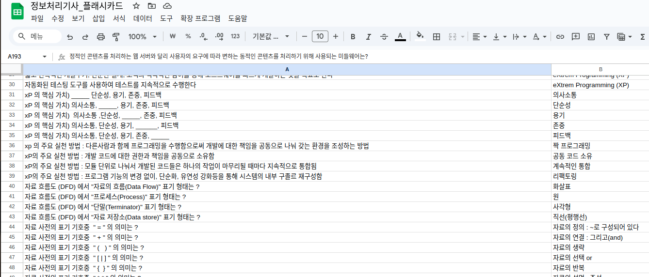 참고로 정보처리기사 시험의 모든 범위를 작성하지 못 했습니다. 개인적으로 알고 있는 부분들은 작성하지 않았고, 공부하면서 모르는 부분들로만 정리했기 때문에 사용하실 분들 중 내용이 부족하신 분은 스스로 추가해서 사용하시면 됩니다~