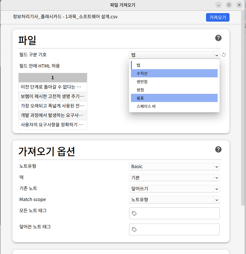 5. 구글 스프레드 시트로 작업한 정보처리기사 1과목 소프트웨어 설계 내용을 CSV 형식으로 내보내기 하고, 이를 Anki 소프트웨어에서 가져온다(import).