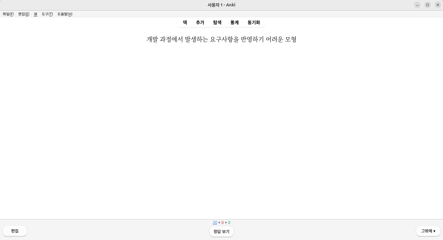 공부를 시작하면 문제 내용이 나오고, 입으로 직접 답을 말하며 공부하는 것을 추천한다. 정답보기는 스페이스 바가 단축키 이며 버튼을 클릭해도 된다.