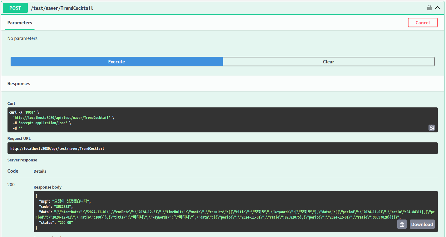 "data": "{\"startDate\":\"2024-11-01\",\"endDate\":\"2024-12-31\",\"timeUnit\":\"month\",\"results\":[{\"title\":\"모히또\",\"keywords\":[\"모히또\"],\"data\":[{\"period\":\"2024-11-01\",\"ratio\":94.84311},{\"period\":\"2024-12-01\",\"ratio\":100}]},{\"title\":\"마티니\",\"keywords\":[\"마티니\"],\"data\":[{\"period\":\"2024-11-01\",\"ratio\":82.82075},{\"period\":\"2024-12-01\",\"ratio\":90.97028}]}]}",
