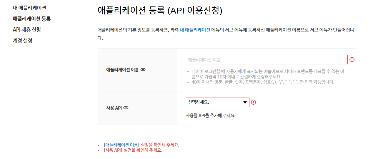 2.애플리케이션 정보를 등록하여 API key 를 발급 받는다.