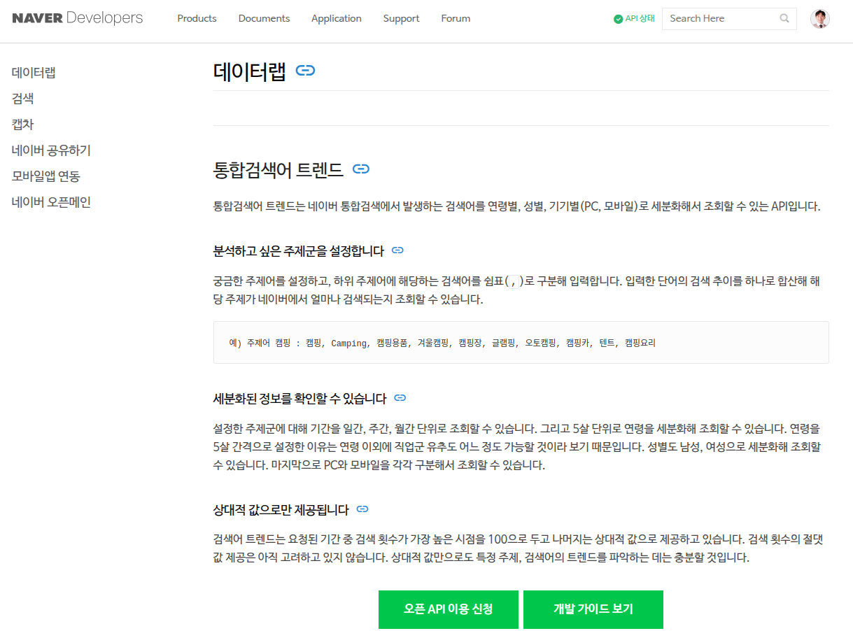 이전 내용에서는 현재 진행 중인 SpringBoot 프로젝트에서 Google Trend API 를 사용하는 방법을 시도 해 봤다. 이번엔 추가로 국내 사용자들이 많이 이용하는 검색포털인 Naver 의 검색량도 API로 받아와 프로젝트에서 사용해 보는 법을 시도해 보려 한다. 이렇게 두 개의 API를 통해 도출한 데이터(검색어 TOP5)를 가지고 추천 알고리즘을 사용자가 선택하게 하거나, 자체적으로 가중치를 부여해서 사용자에게 추천해주는 방법을 고려해보려 한다.