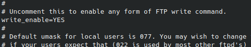 -> 현재 사용하려는 기능과 상관 없으니 그대로 놔둔다 - write_enable=YES 파일 업로드를 허용하려면 이 옵션을 활성화 해야 한다. ( 주석 처리 되어있다)