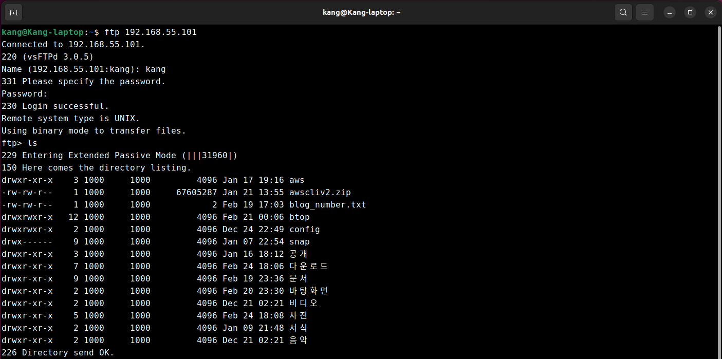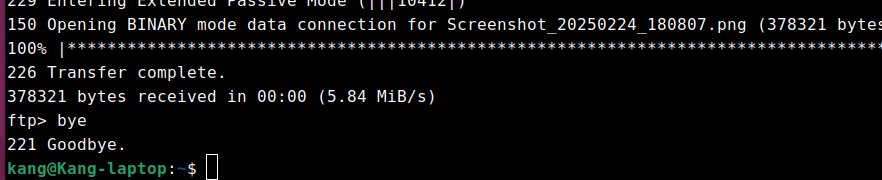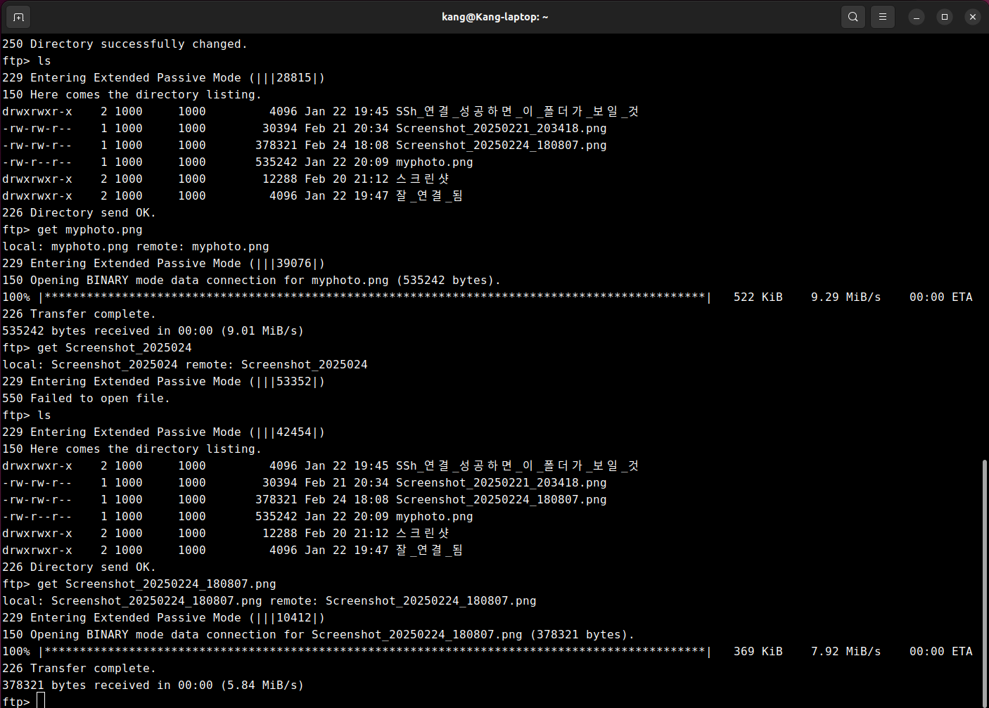 이렇게 등록하면 local directory now : /home/kang/사진/스크린샷 이라는 리턴값이 돌아오고. 여기서 업로드 하고 싶은 파일들을 하나하나 put 파일명 으로 업로드 하거나, 폴더내용 전체를 업로드 하고 싶다면 mput * 명령어를 입력하면 된다.