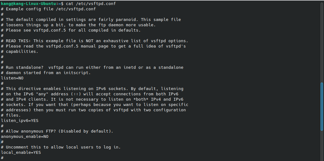 - listen=NO : 이 설정은 vsftpd가 inetd에서 실행되도록 설정 된 상태이다. standalone 모드로 실행하려면 listen=YES로 변경해야 한다.