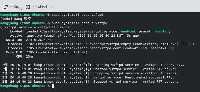 FTP 프로토콜에 대한 연습이 끝났으므로, 클라이언트에서는 bye 명령어로 접속을 종료해주고 서버(데스크탑)에서는 아래 명령어로 FTP 서비스를 중지한다.