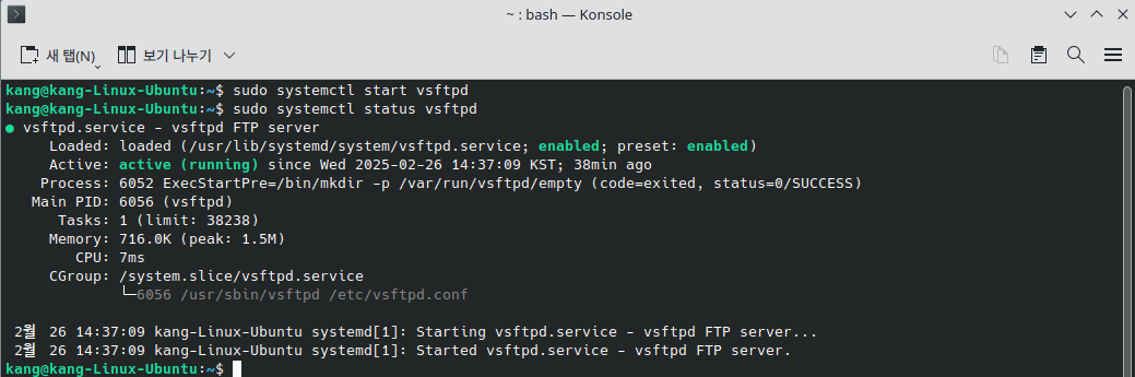 아래 명령어로 FTP 서비스를 활성화 하고 정상적으로 시작되었는지 확인해본다.