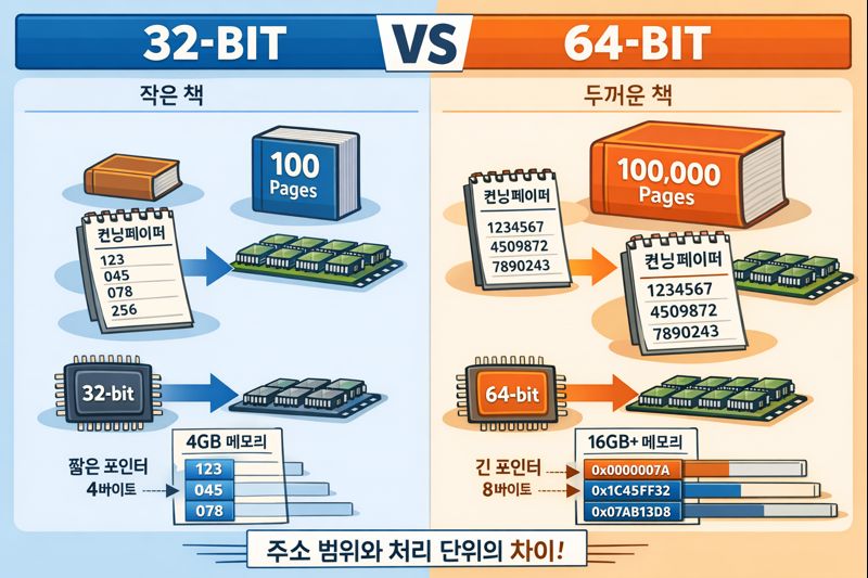 프로그램을 다운로드 받을 때, CPU 가 인텔 것 인지, 애플 실리콘 칩인지 구분하여 받는 것처럼 시스템 아키텍쳐가 32비트 인지, 64비트인지 구분하여 다운로드 받을 수 있도록 되어있다. 이 둘은 어떤 차이길래 소프트웨어 설치 시 구분되어 설치하도록 되어있는 것 일까? 먼저 한 가지 이유를 비유를 통해 쉽게 알아보자 1. 비유로 이해하기: 컨닝페이퍼와 책컴퓨터가 메모리를 다루는 방식은, 시험장에서 책을 펼쳐 참고하면서 문제를 푸는 상황(오픈북 시험)으로 비유해볼 수 있다.책: 메모리(혹은 데이터가 담긴 거대한 저장 공간)페이지 번호: 주소(address)컨닝페이퍼: CPU 캐시(혹은 CPU가 가까이 두고 자주 쓰는 빠른 공간)“다음에 참고할 페이지 번호 목록”: 포인터(pointer)- 32비트는 “페..