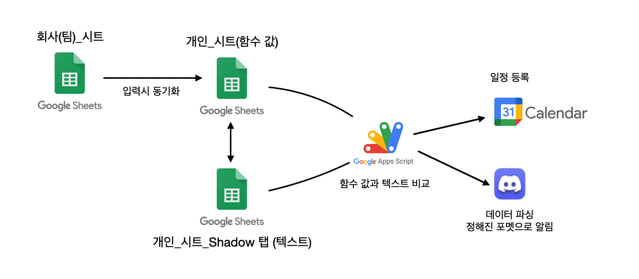 설 연휴를 맞아, 평소에 회사에서 이게 자동화가 되면 편할텐데 라고 생각했던 기능(?) 을 만들어보도록 하자!1. 문제 상황: "가로로 끝없이 늘어나는 일정 시트"우리 팀에서 외근 일정을 기록하기 위해 사용하는 구글 스프레드 시트는 날짜가 지나감에 따라 열(Column)이 오른쪽으로 계속 늘어나는 구조이다. 부장님이 직접 해당 인원의 일정을 칸에 추가해 주시는데, 이를 매번 확인해서 개인 구글 캘린더에 옮겨 적었었는데, 일정이 등록되면 알람이 오고, 캘린더에 자동으로 등록되면 정말 편하겠다는 생각이 들었다.문제점 1: 공유 시트를 매번 직접 열어서 확인해야 함. (공유 시트의 내용 중 함부로 건드리면 안되는 탭들도 있음)문제점 2: 캘린더에 수동으로 입력하다 보니 누락이나 오타 발생 가능성.문제점 3: ..